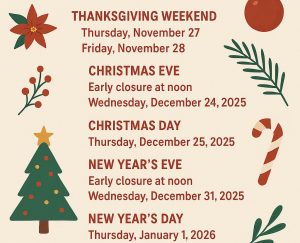 As the holiday season approaches, we want to inform you of our upcoming early closures and full day closures, to allow our Michigan Shores team to spend time with loved ones. Please click on the flyer below to view full sized: